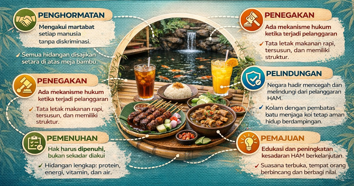 Di sebuah lesehan tepi kolam koi, sepiring nasi putih mengepul pelan. Di sebelahnya, sate berlumur bumbu kecap mengilap. Tengkleng kambing dalam mangkuk tanah liat mengepulkan aroma rempah. Dua gelas tinggi—es teh dan es jeruk—berkeringat di udara sore yang lembap. Pemandangan ini, bagi sebagian orang, mungkin sekadar santap biasa. Namun, bila ditarik sedikit lebih jauh, ia seperti ringkasan kecil tentang bagaimana hak asasi manusia seharusnya bekerja.